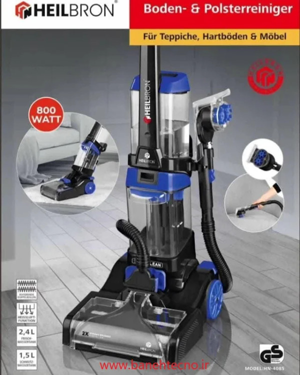 فرش شور هیلبرون (Heilbron) مدل HN-4085 یک دستگاه خانگی چند منظوره برای شستشوی فرش، مبل، موکت و سطوح دیگر مانند سرامیک و پارکت است. این دستگاه دارای موتور ۲۰۰۰ وات با قابلیت مکش ۸۰۰ وات است. همچنین دارای سیستم خشک کن است و میتواند تا ۷۰ درصد رطوبت را از سطوح گرفته و خشک کند. مخزن آب آن ۲.۱ لیتر گنجایش دارد و مجهز به دو فیلتر قابل تعویض است.